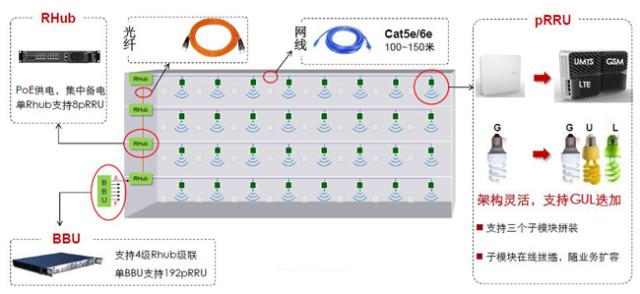 與無源室分系統(tǒng)相比,有源室分系統(tǒng)主要上由BBU、RHUB、pRRU三部分組成,BBU基帶處理單元首先連接到RHUB上,RHUB就類似于一個集線器(或交換器),可以連接多個pRRU,這里的pRRU可以看做傳統(tǒng)基站上的RRU的“小型化”,而收發(fā)天線就集成在pRRU內(nèi)部。實際上,這樣的組網(wǎng)方式也叫做“分布式皮基站”。與此相對應(yīng)的是“一體化皮基站”,也就是把BBU、pRRU集合成一體。一般來說,“一體化皮基站”覆蓋較小的簡單區(qū)域,“分布式皮基站”對于復(fù)雜的區(qū)域,擴(kuò)展方便。