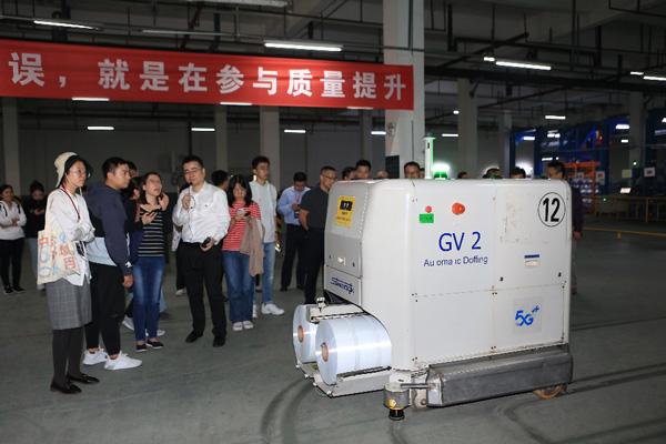 筆者參觀浙江新鳳鳴集團(tuán),廠內(nèi)的IGV小車正在沿著規(guī)定的路線搬運(yùn)絲餅,絲餅位于下方白色長筒狀,小車受5G網(wǎng)絡(luò)控制,在廠區(qū)車間移動