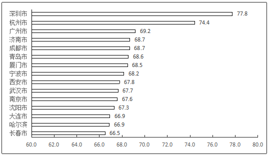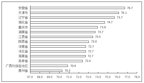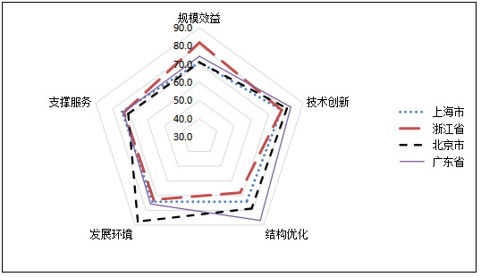 本年領(lǐng)先省份綜合發(fā)展指數(shù)均值為73.8,比上年上升2.5個(gè)分值,技術(shù)創(chuàng)新指數(shù)增長突出,廣東省綜合得分最高;中間省份綜合發(fā)展指數(shù)均值73.5,比上年上升3.4個(gè)分值,規(guī)模發(fā)展指數(shù)增長較快,安徽省綜合得分最高;潛力省份綜合發(fā)展指數(shù)均值65.0,發(fā)展環(huán)境指數(shù)增幅相對較快,山西省綜合得分最高;重點(diǎn)城市綜合發(fā)展指數(shù)均值69.0,比上年提高0.8個(gè)分值,支撐服務(wù)指數(shù)增幅突出,深圳市綜合得分最高。