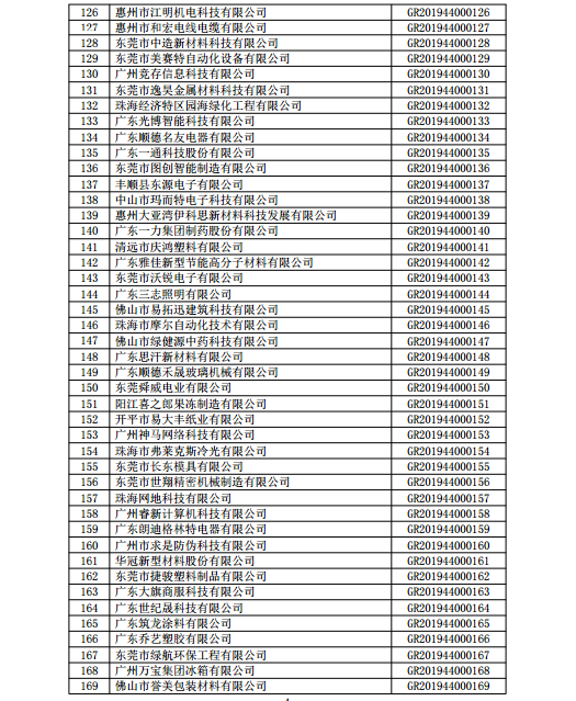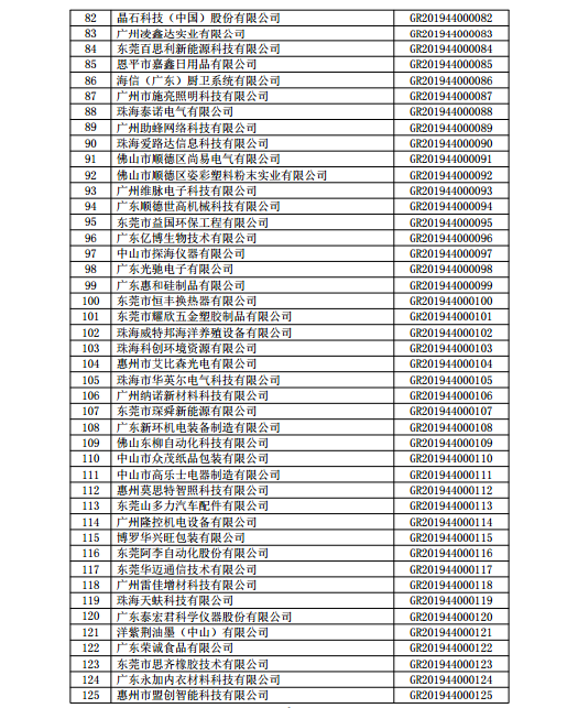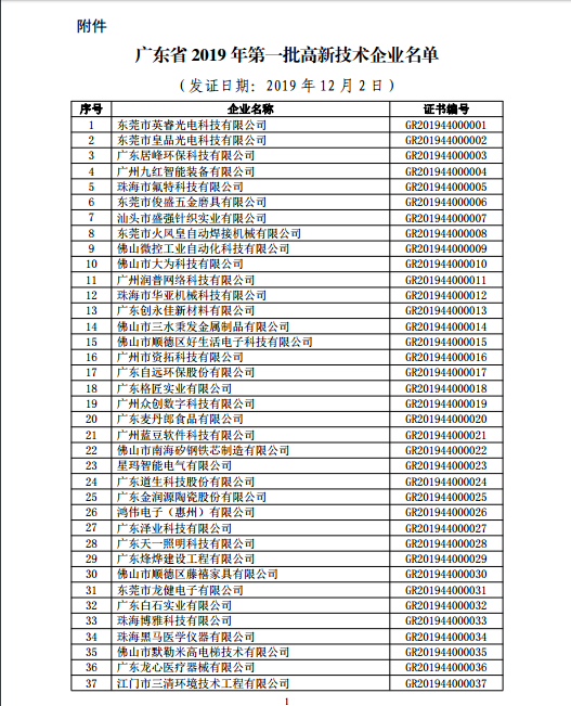 你們上報的《關(guān)于廣東省2019年高新技術(shù)企業(yè)認(rèn)定備案的函》(粵科函高字〔2019〕1730號)收悉�,F(xiàn)將公示無異議的東莞市英睿光電科技有限公司等3202家企業(yè)予以高新技術(shù)企業(yè)備案。請你們按照《廣東省2019年第一批高新技術(shù)企業(yè)名單》(詳見附件)中的企業(yè)名稱、高新技術(shù)企業(yè)證書編號和發(fā)證日期打印并頒發(fā)“高新技術(shù)企業(yè)證書”。