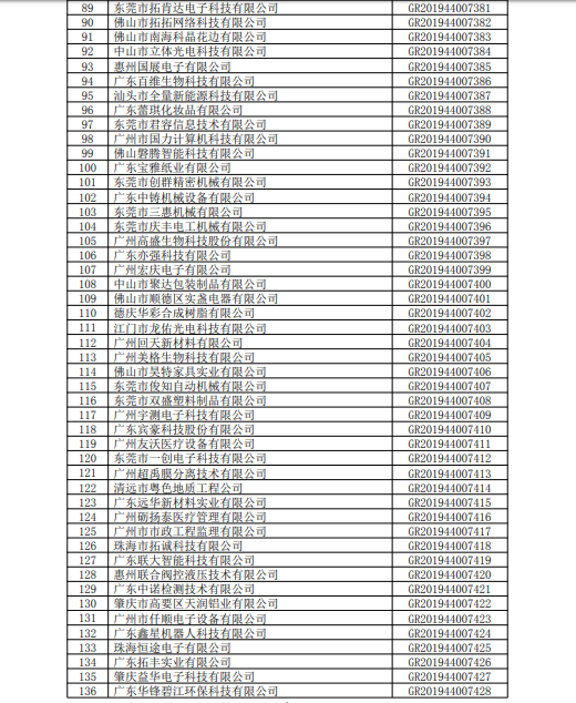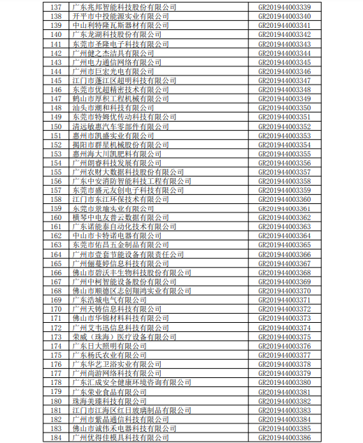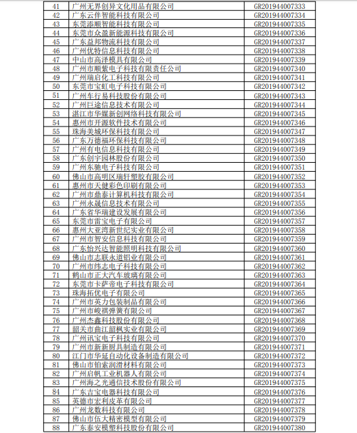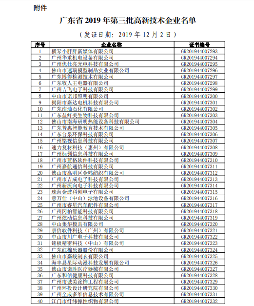 你們上報(bào)的《關(guān)于廣東省2019年高新技術(shù)企業(yè)認(rèn)定備案的函》(粵科函高字〔2019〕1730號(hào))收悉�,F(xiàn)將公示無(wú)異議的橫琴小胖胖新媒體有限公司等3236家企業(yè)予以高新技術(shù)企業(yè)備案。請(qǐng)你們按照《廣東省2019年第三批高新技術(shù)企業(yè)名單》(詳見(jiàn)附件)中的企業(yè)名稱、高新技術(shù)企業(yè)證書(shū)編號(hào)和發(fā)證日期打印并頒發(fā)“高新技術(shù)企業(yè)證書(shū)”。
